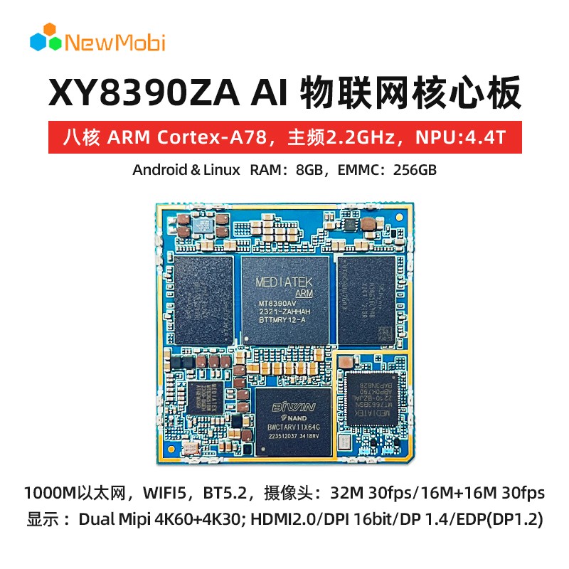 CPU:MT8390( Genio 700) GPU:Mali-G57 MC3 NPU:4.4TOPs 架構:2xA78 2.2Ghz + 6xA55 2.0Ghz 內存:4GB+64G/6G+128G/8G+256G 操作系統:Android & Linux 網絡支持:1000M以太網 無線連接:Wifi5